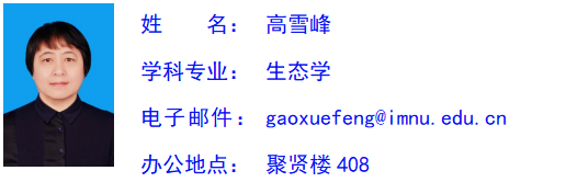 高雪峰,女,汉族,博士,副教授,学术研究生导师。研究方向微生物生态和土壤生态学。先后主持国家自然科学基金1项,内蒙古自然科学基金2项以及地厅级项目3项。出版研究专著1部,发表科研论文20余篇,教学研究论文2篇。2005年(第五届)和2015年(第九届)获内蒙古师范大学中青年教师教学技能大赛三等奖。2012年和2021年获内蒙古师范大学教学成果二等奖。先后承担本科生的土壤学、土壤学实验、恢复生态学、城市生态学、保护生物学、植物形态解解剖学、普通生态学实验、无机化学实验等课程的教学工作。并承担本科生的社会调查和应用生态学实习指导工作。承担研究生的土壤生态学、恢复生态学研究进展、可持续生态学(城市与可持续发展部分)和高级生态学(微生物生态学部分)课程的教学工作。