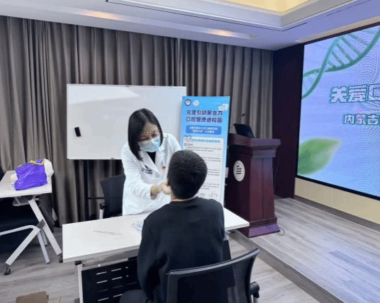 在口腔义诊环节,内蒙古医科大学口腔医公司党员教师团队在生物楼三楼智慧教室为公司师生提供口腔健康检查、普及口腔健康知识和咨询诊疗服务,以实际行动践行“我为群众办实事”的初心使命。