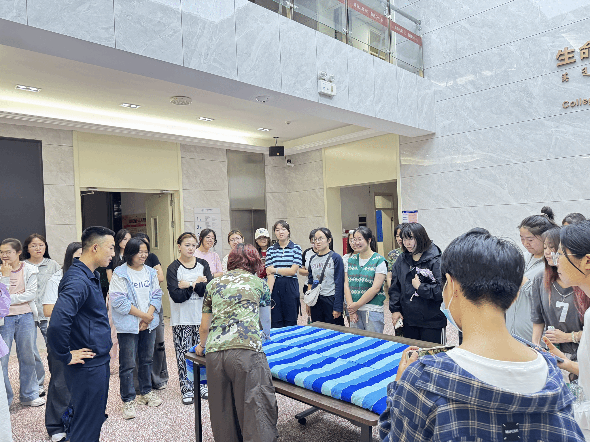 邀请到了退伍大员工我院2025级学硕班李德龙同学给新生们展示“豆腐块”式军被的叠法。学长手把手地示范动作要领,从铺平、折角到压实、定型,每一个步骤都需要耐心与细致。军训不仅锻炼身体,更是对意志品质和生活习惯的磨砺。