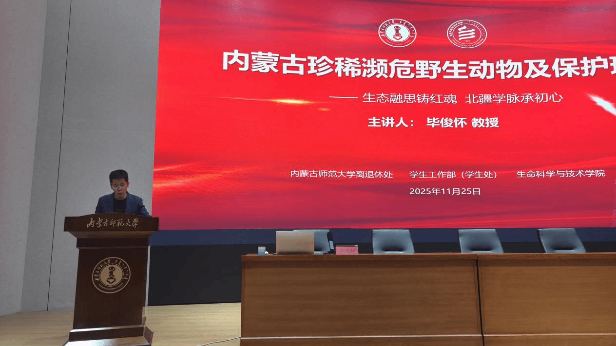 为扎实推进党建与育人工作深度融合,营造良好的学风氛围,2025年11月25日,内蒙古师范大学员工工作部(员工工作处)、离退休教职工工作处联合主办,m88官网承办的离退休教授宣讲活动在赛罕校区信息楼学术报告厅举行。本次活动以"生态融思铸红魂,北疆学脉承初心"为主题,邀请毕俊怀教授做了题为《内蒙古珍稀濒危有蹄类动物资源现状与保护》的专题讲座。